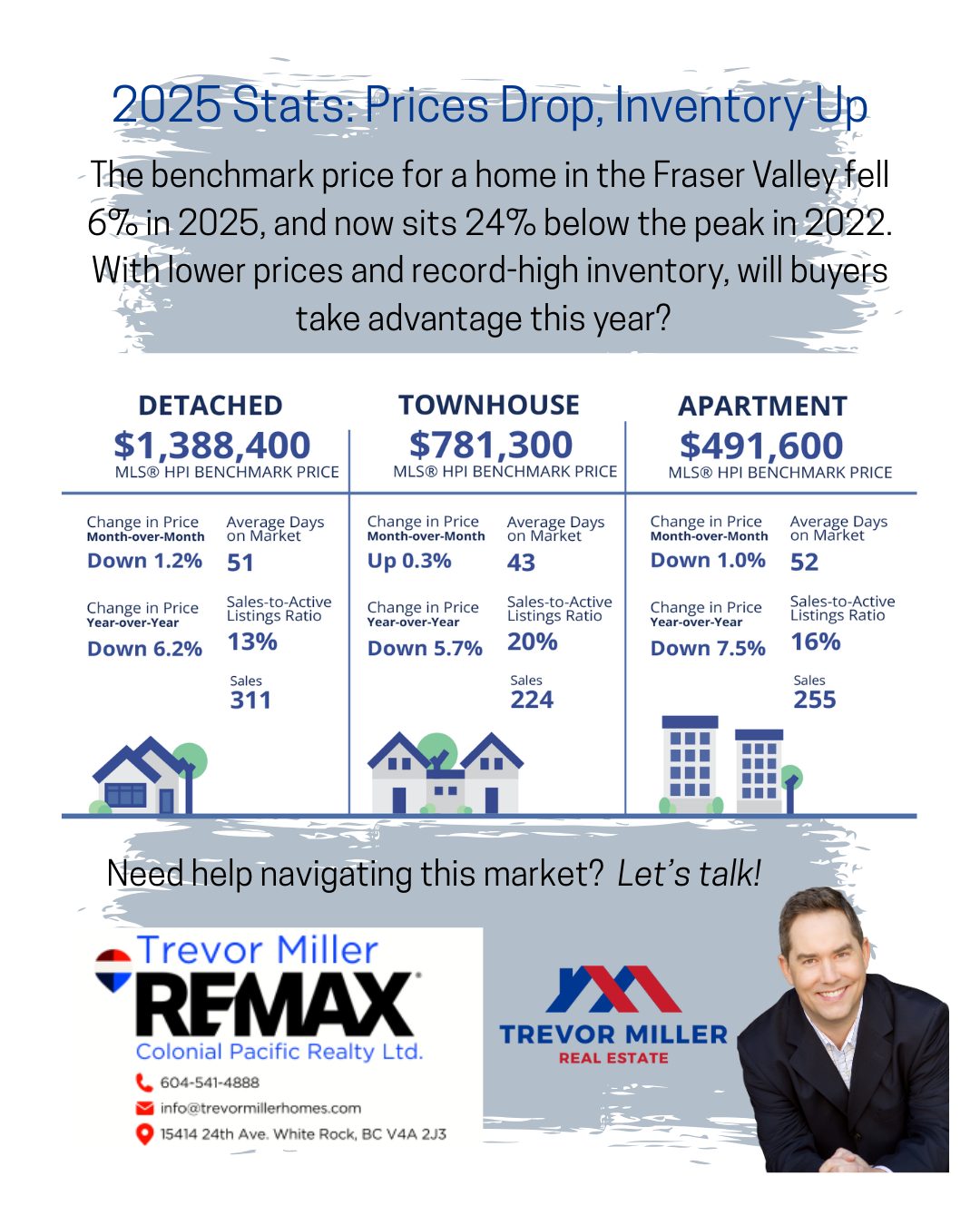 Decade-high inventory and softer prices failed to spark buyer demand in the Fraser Valley in 2025. Despite favourable conditions and increased negotiating power, many buyers stayed on the sidelines, making it one of the slowest years for sales in decades.