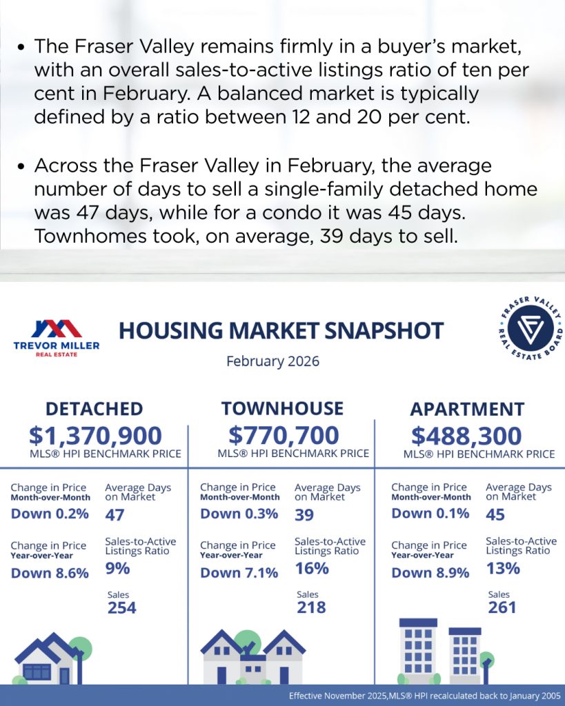 “Affordability concerns and economic pressures are weighing heavily on many Fraser Valley households,” said Tore Jacobsen, Chair of the Fraser Valley Real Estate Board. “Our REALTORS® understand how personal and complex these decisions are. But there are encouraging signs for buyers. Composite prices are closer to early-2023 levels, inventory has improved, and there is more space to negotiate than we’ve had in recent years.”
